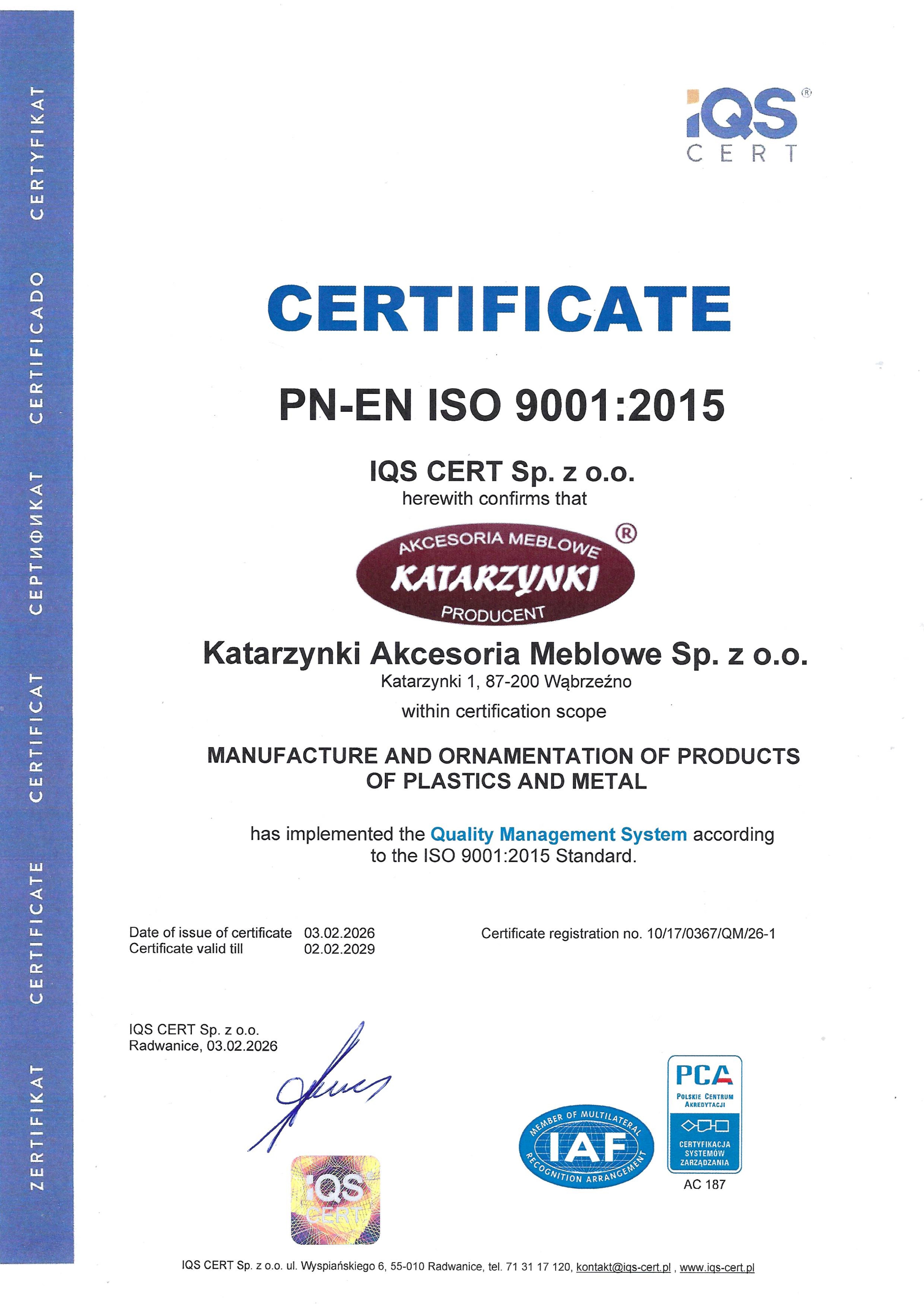 We are pleased to announce that our companies ZPTSz Halina Błażejewicz-Sowa and Katarzynki Akcesoria Meblowe Sp. z o.o. are holders of ISO certificates confirming our commitment to the highest quality and safety standards.